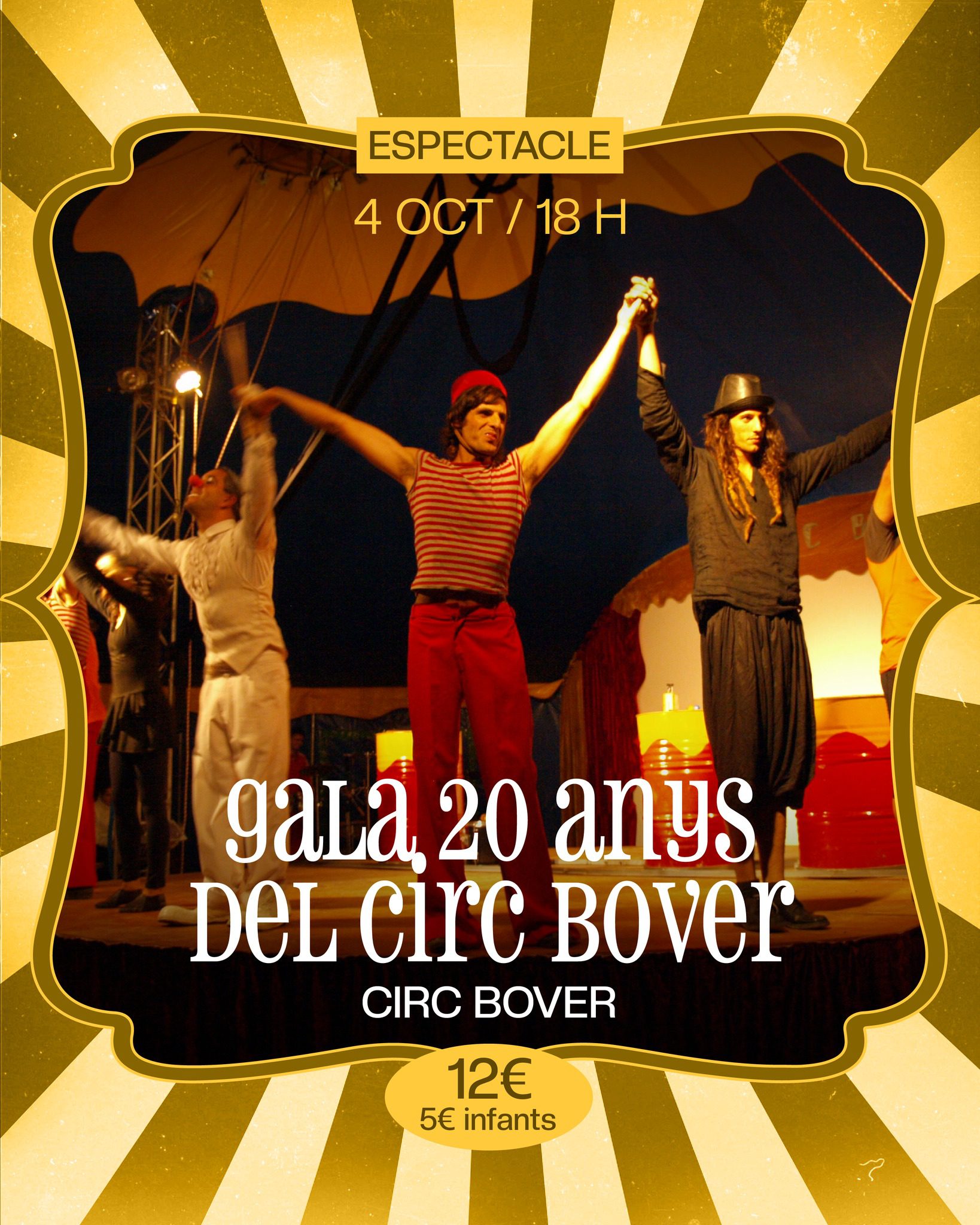 El Circ Bover celebra 20 anys i ho fa envoltat dels artistes més propers a la companyia en una gala única. Un espectacle que combina números de circ amb fragments del documental sobre el Circ Bover, oferint un viatge per la història d’una companyia que, amb esforç i lluita, s’ha mantingut en peu apostant per un circ sostenible i compromès amb la cultura local.